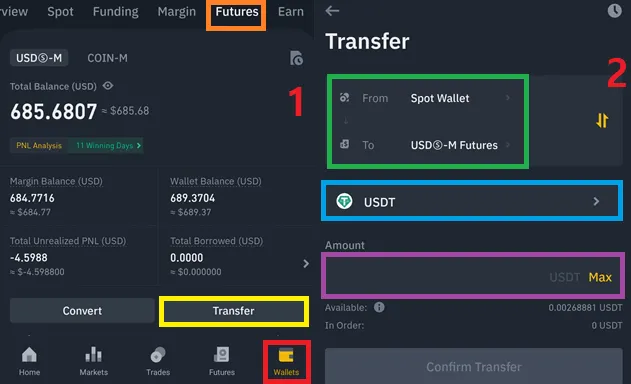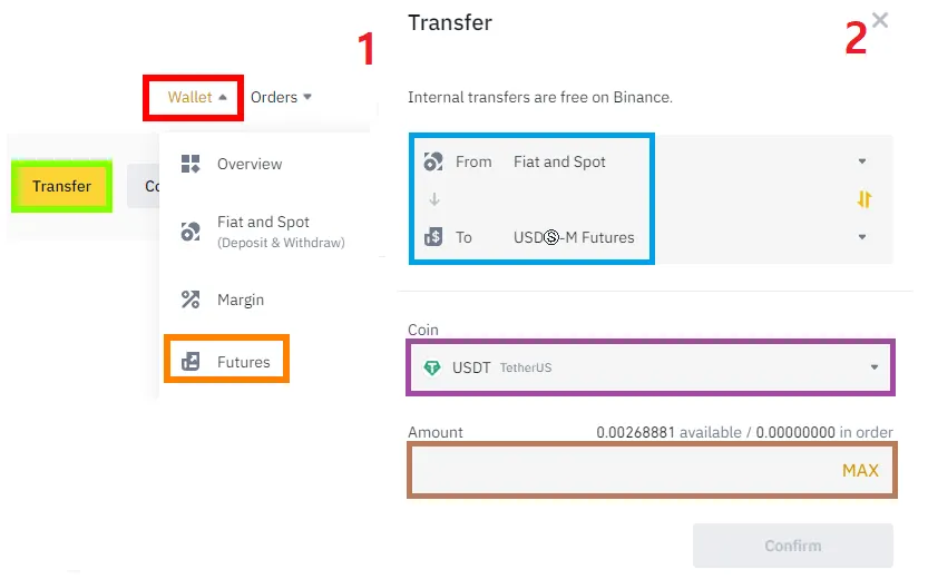 Wallet - Futures - Transfer - ( Spot → USD-M ) - USDT - 금액 입력 - Confirm