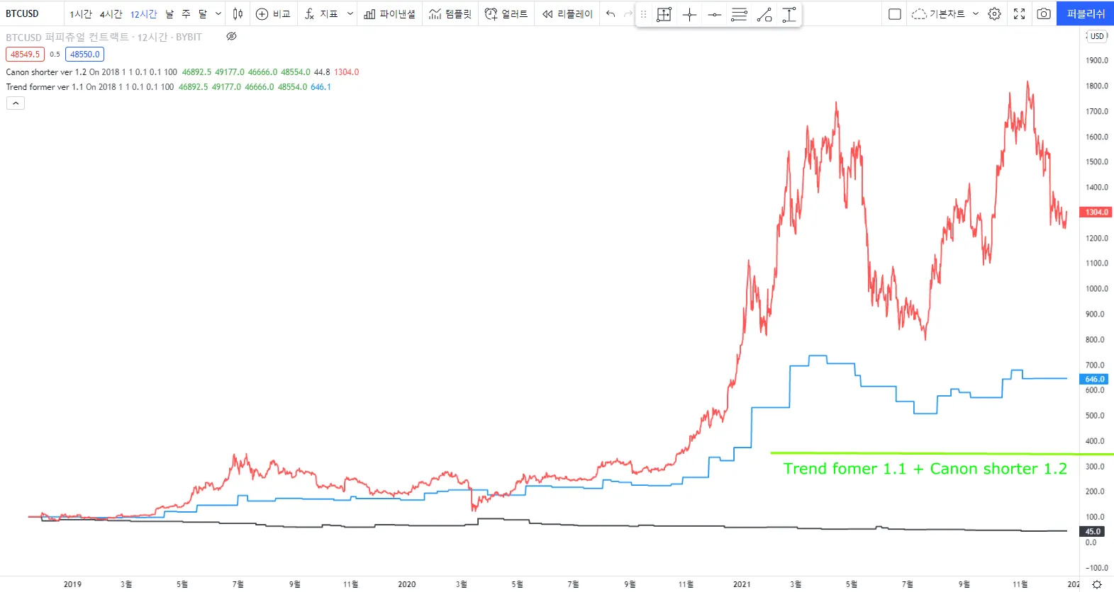 Trend former 1.1와 Canon shorter 1.2의 시드변화 그래프는 초기시드 100, 수수료 0.1%, 슬리피지 0.1%를 기본 값으로 적용되었습니다.