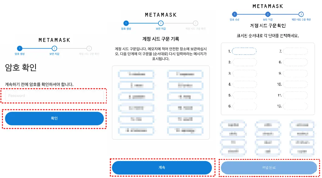 암호확인 → 시드 구문 백업 ( 스샷 or 메모장 or 노트 기록 ) → 복구 구문 순서대로 클릭