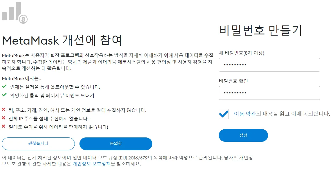 확장 프로그램 추가 → 시작하기 → 지갑 생성