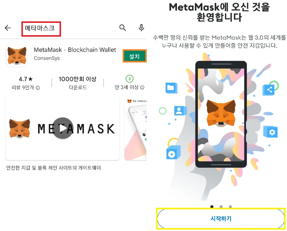 앱스토어 → 메타마스크 검색 → 설치 → 시작하기