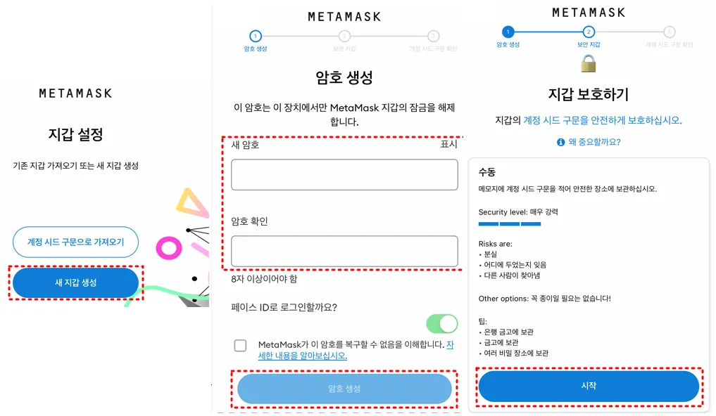 새 지갑 생성 → 새 암호 → 암호 생성 → 지갑 보호하기 시작