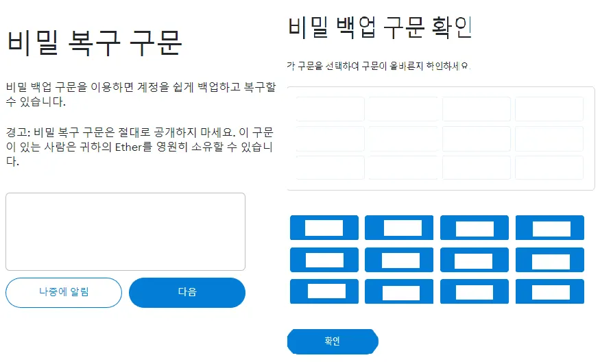 비밀 복구 구문 따로 백업 ( 스샷 or 메모장 or 노트 기록 ) → 복구 구문 순서대로 클릭