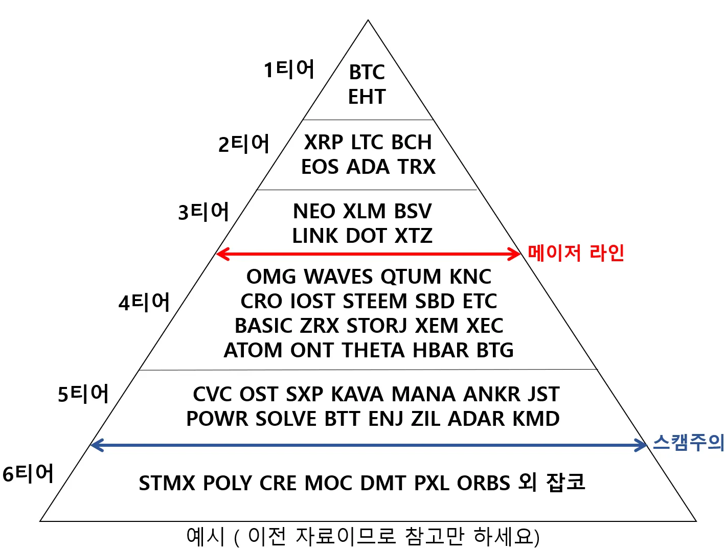 보통 메이저는 ADA(에이다), BTC(비트), BCH(비캐), EOS(이오스), ETH(이더리움), LTC(라코), TRX(트론), XRP(리플)로 본다.