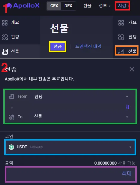 지갑 - 선물 - 전송 - ( 펀딩 → 선물 ) - USDT - 금액 입력