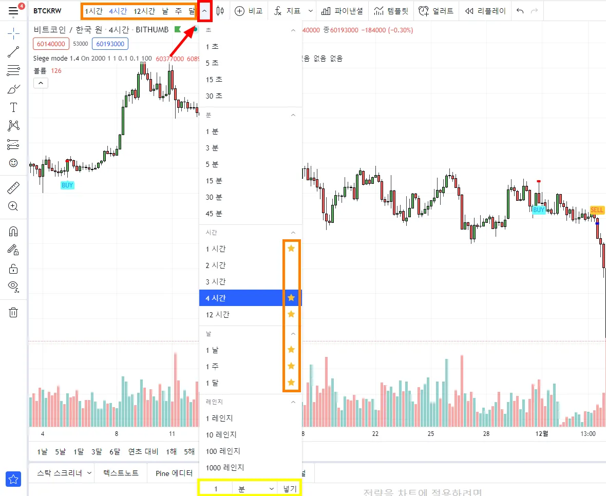 ^를 누르면 원하는 타임 프레임을 설정하실 수 있습니다. 별을 클릭하면 메뉴에 즐겨찾기 됩니다