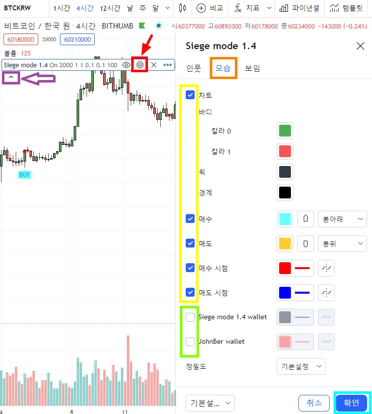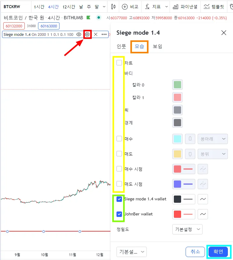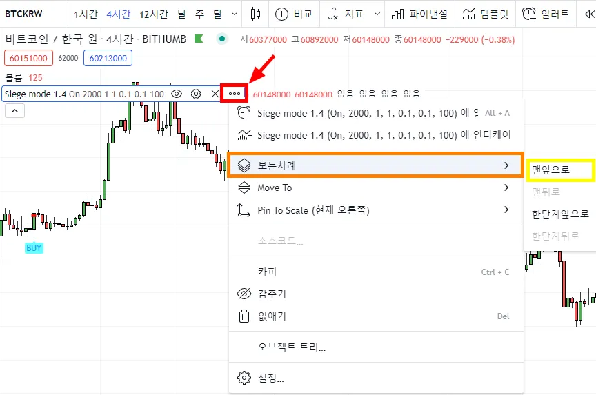 빨간 박스의 점 3개를 누르고 보는 차례를 맨앞으로 설정해주세요. 지표의 시그널이 보입니다.