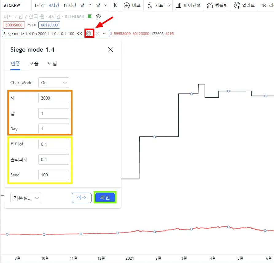 톱니바퀴 - 인풋에 들어가면 백테스트 조건을 변경 할 수 있습니다.