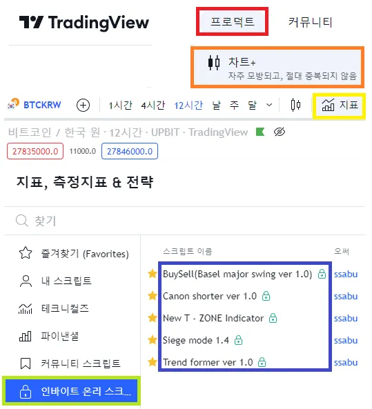 프로덕트 - 차트 - 지표 - 인바이트 온리 스크립트 - 전송받은 지표 1번 클릭