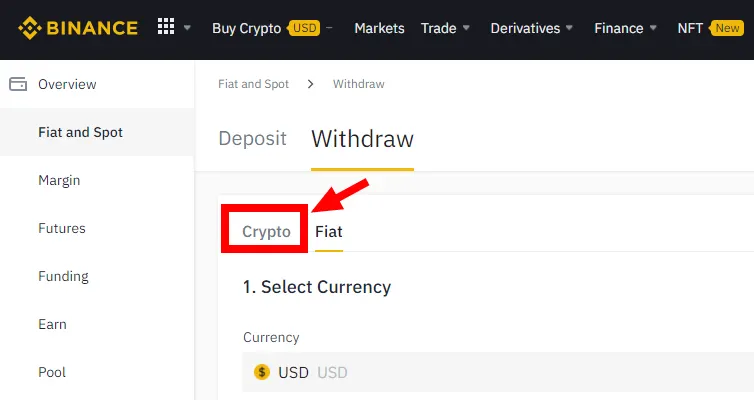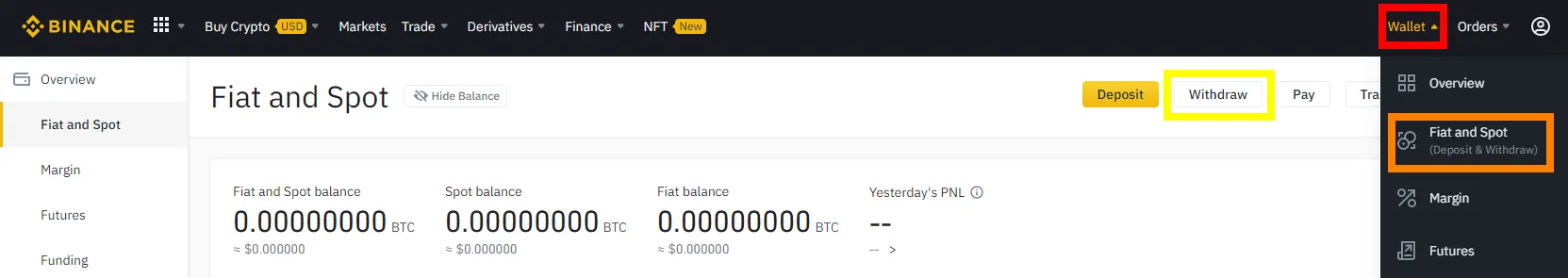 바이낸스에 접속하여 Wallet - Flat and Spot - Withdraw를 차례대로 클릭하세요.