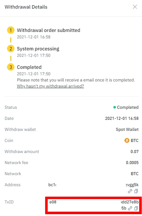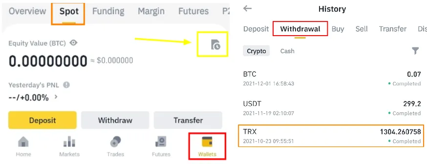 Wallets - Spot - 노란 박스의 거래 기록 클릭 - Withdrawal (출금기록) 에서 내역을 확인