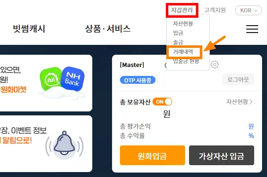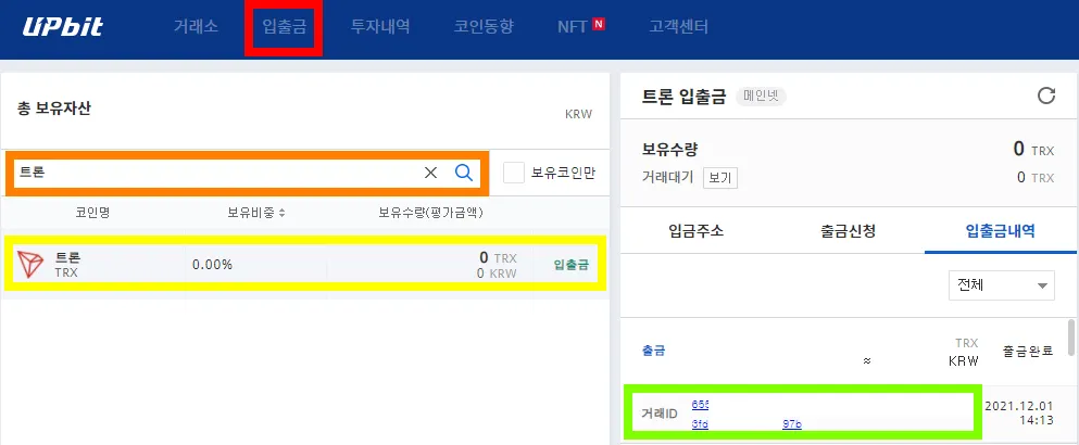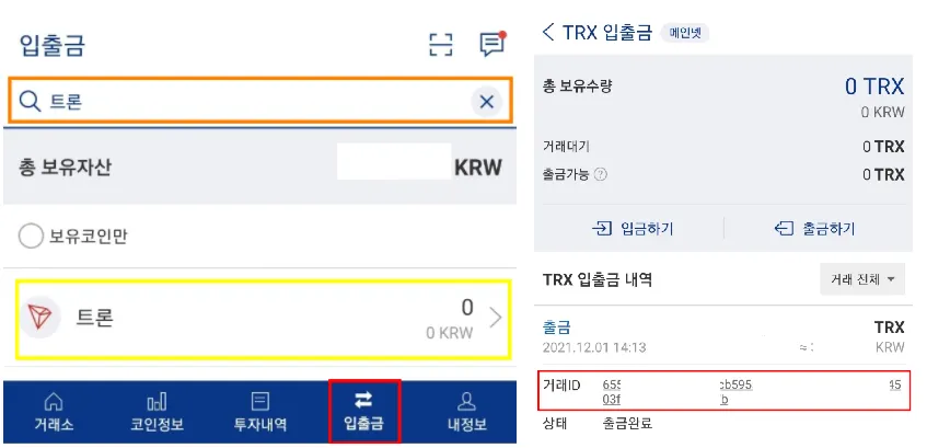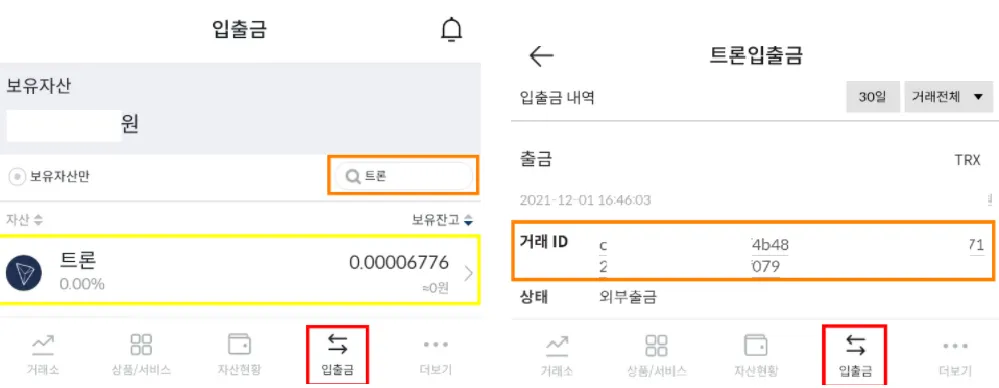 입출금 - 원하는 코인 검색 - 목록에서 클릭 - 입출금 내역에서 거래ID (= TXID) 확인