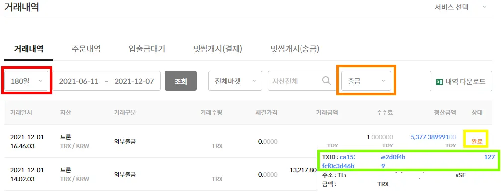기간과 목록을 세팅하고 검색하면 기록이 나옵니다. 완료를 클릭하면 TXID가 나옵니다.