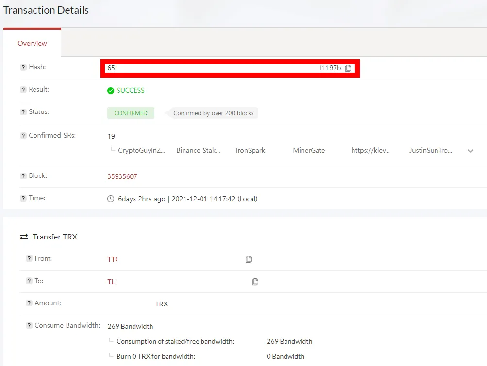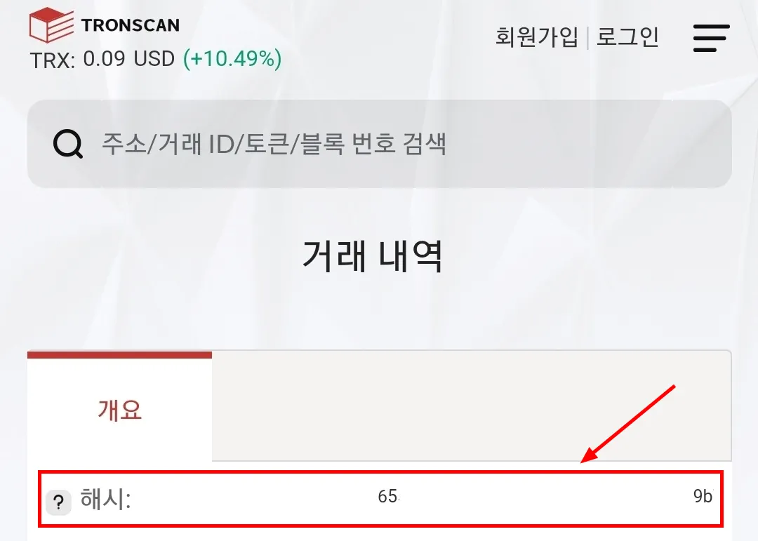 복사가 안되는 경우 초록 박스에서 거래ID를 클릭 - 상세 페이지 접속 후 Hash (= TXID) 확인