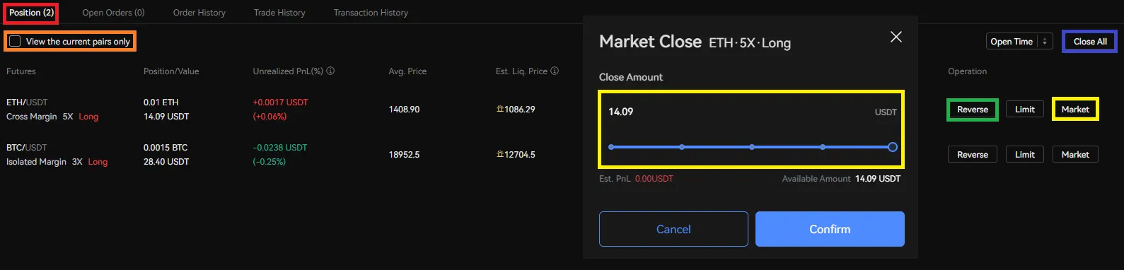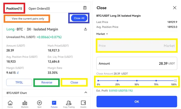 Close - 해당 포지션을 분매, 올매도 ( 지정가, 시장가 ) 할 수 있습니다.