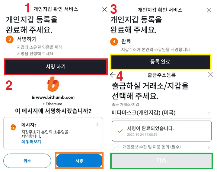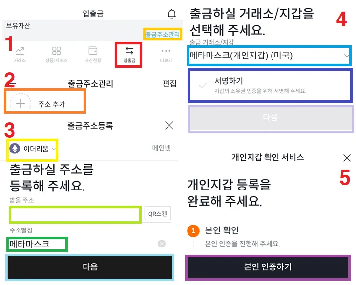 입출금 - 출금주소관리 - 주소추가 - 이더리움 - 메타마스크 주소 입력 - 서명하기 - 본인 인증