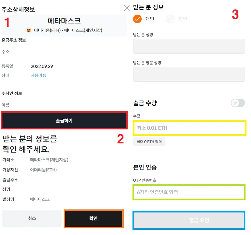 메타마스크 앱 실행 → 이더리움 메인넷 확인 → 주소복사 → 업비트에 주소 입력 → 출금신청