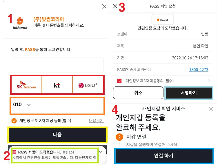 통신사 - 번호 - PASS 인증 클릭 - 서명하기 - 연결하기