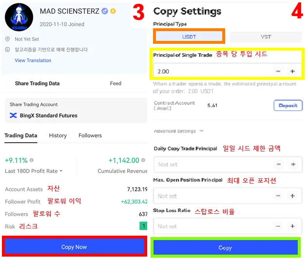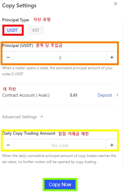 Copy Now → USDT → 종목 당 투입 시드 입력 ( 고급설정 패스해도 됩니다 ) → Copy 클릭