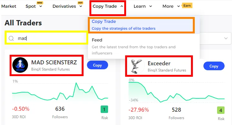 앱 하단 CopyTrade → All Traders → 돋보기 → 검색 → Copy