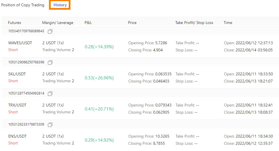 화면 상단의 Trade History에서 과거 카피 기록을 볼 수 있습니다.