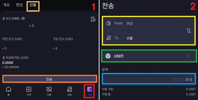 지갑 - 선물 - 전송 - ( 펀딩 → 선물 ) - USDT - 금액 입력