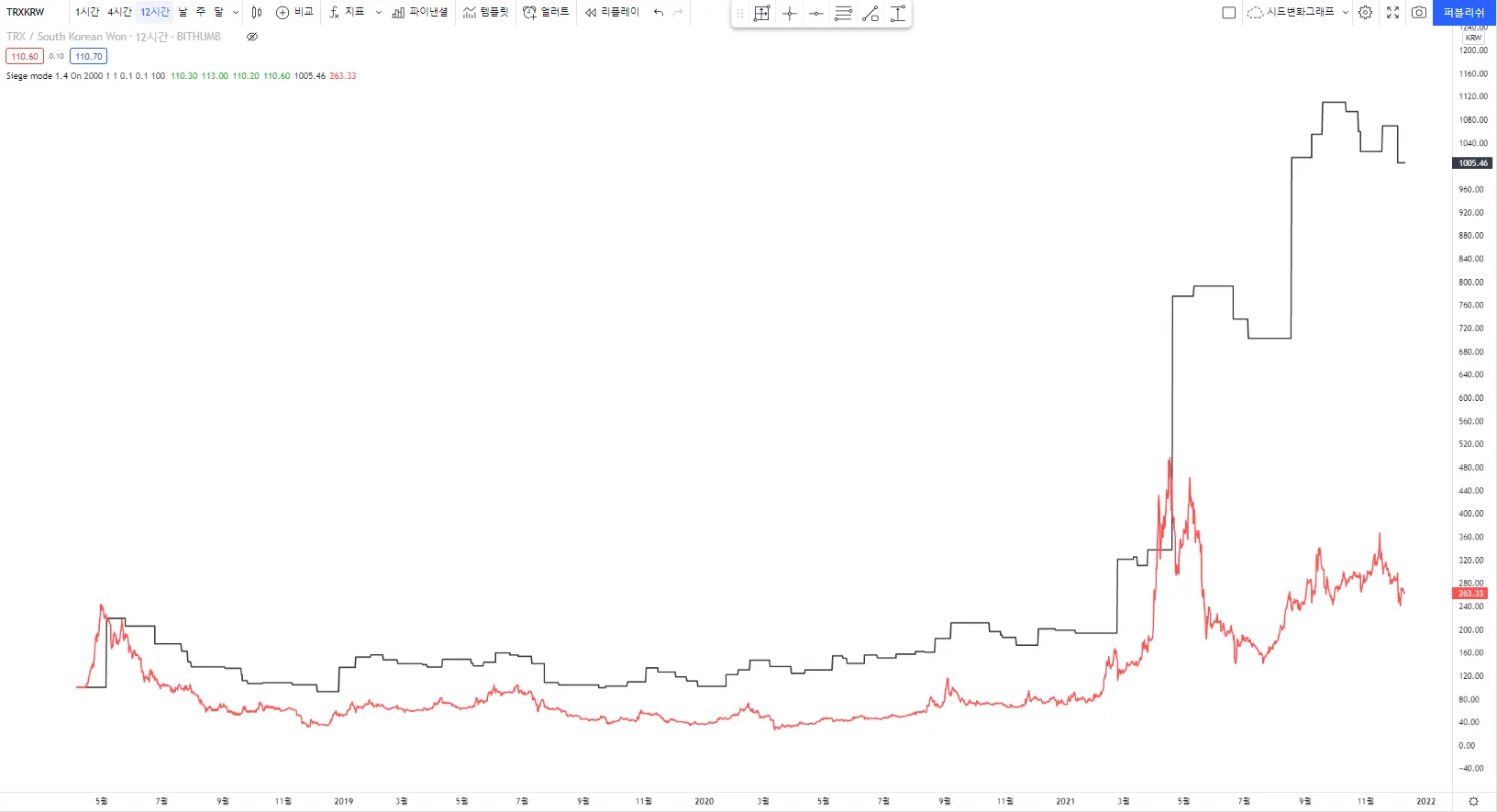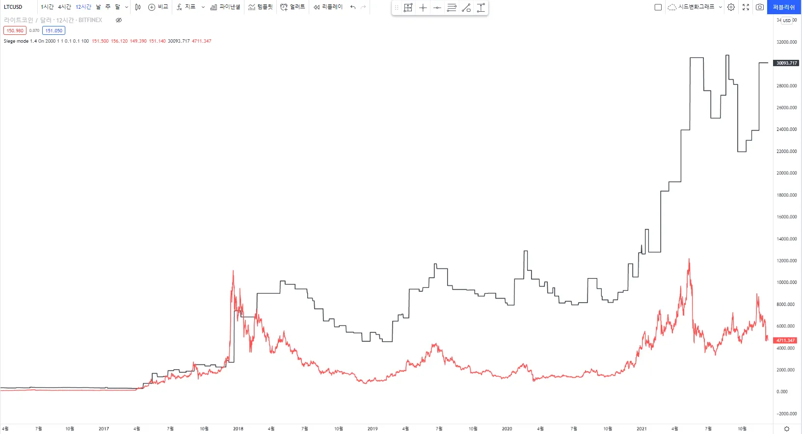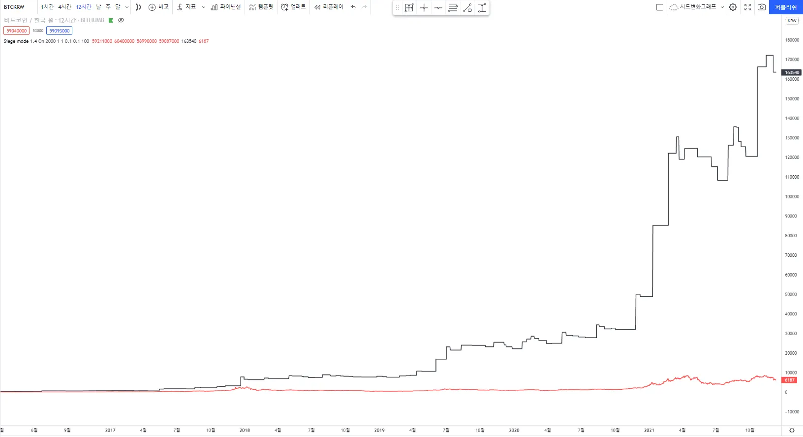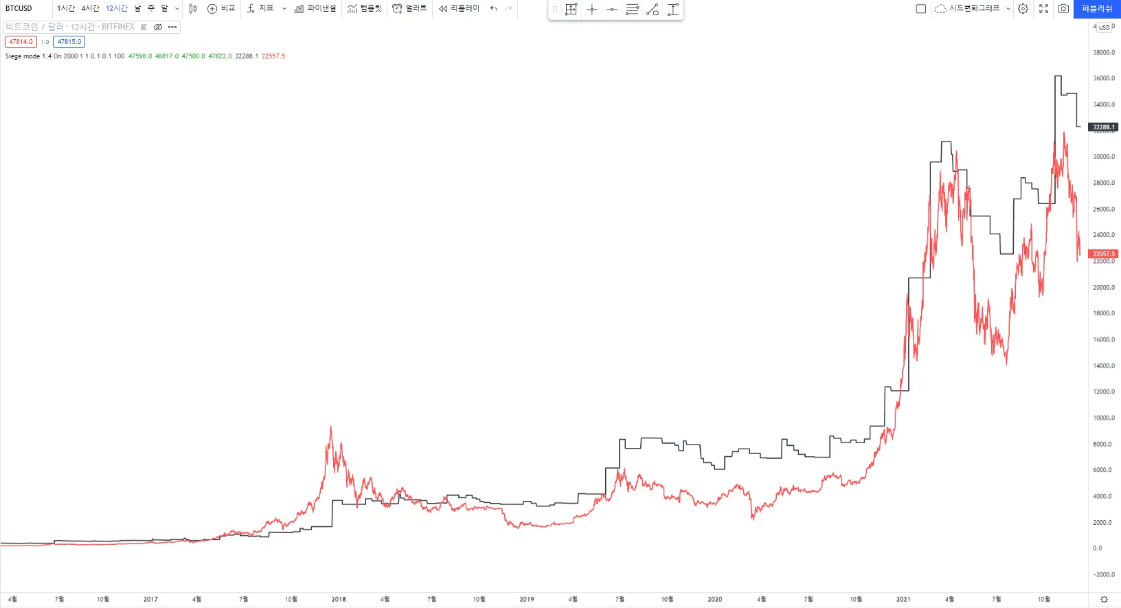 검정선은 Sige mode 1.4의 시그널대로 매매 했을 시 시드변화 그래프입니다.