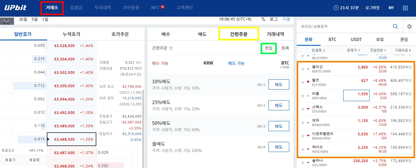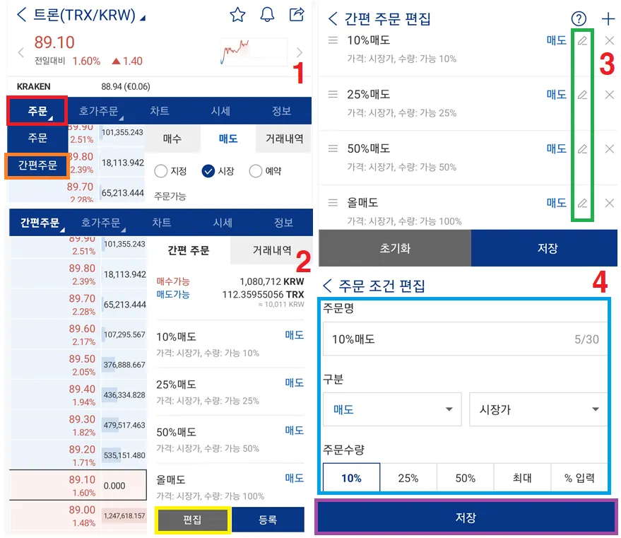 거래소 - 아무 종목이나 선택 - 간편주문 - 편집 클릭 (무지개 순으로 클릭)