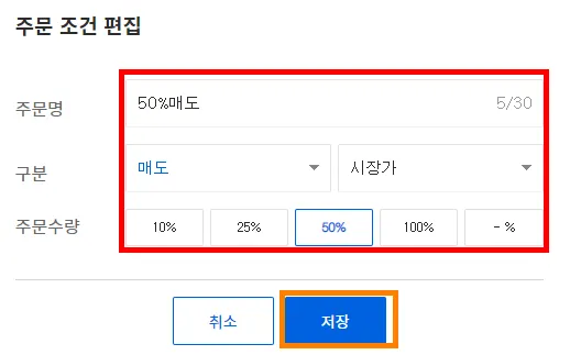 (매수/매도 % = 주문 시점 기준 보유 중인 잔고의 % // + 주문 추가 등록, x 주문 삭제 )