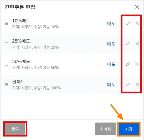 아무 종목이나 클릭 - 주문 - 간편 주문 - 편집 - 연필 - 편집 - 저장